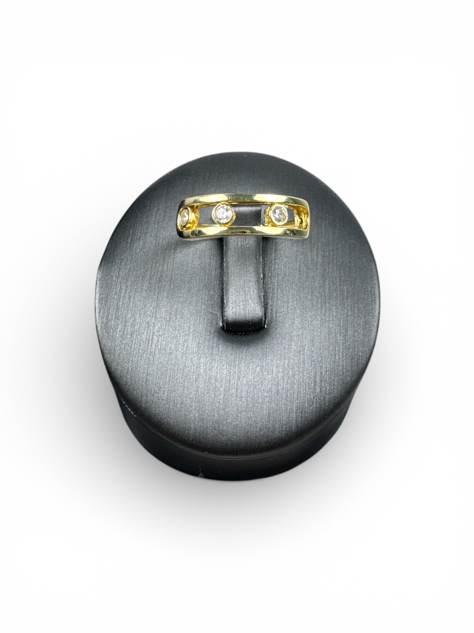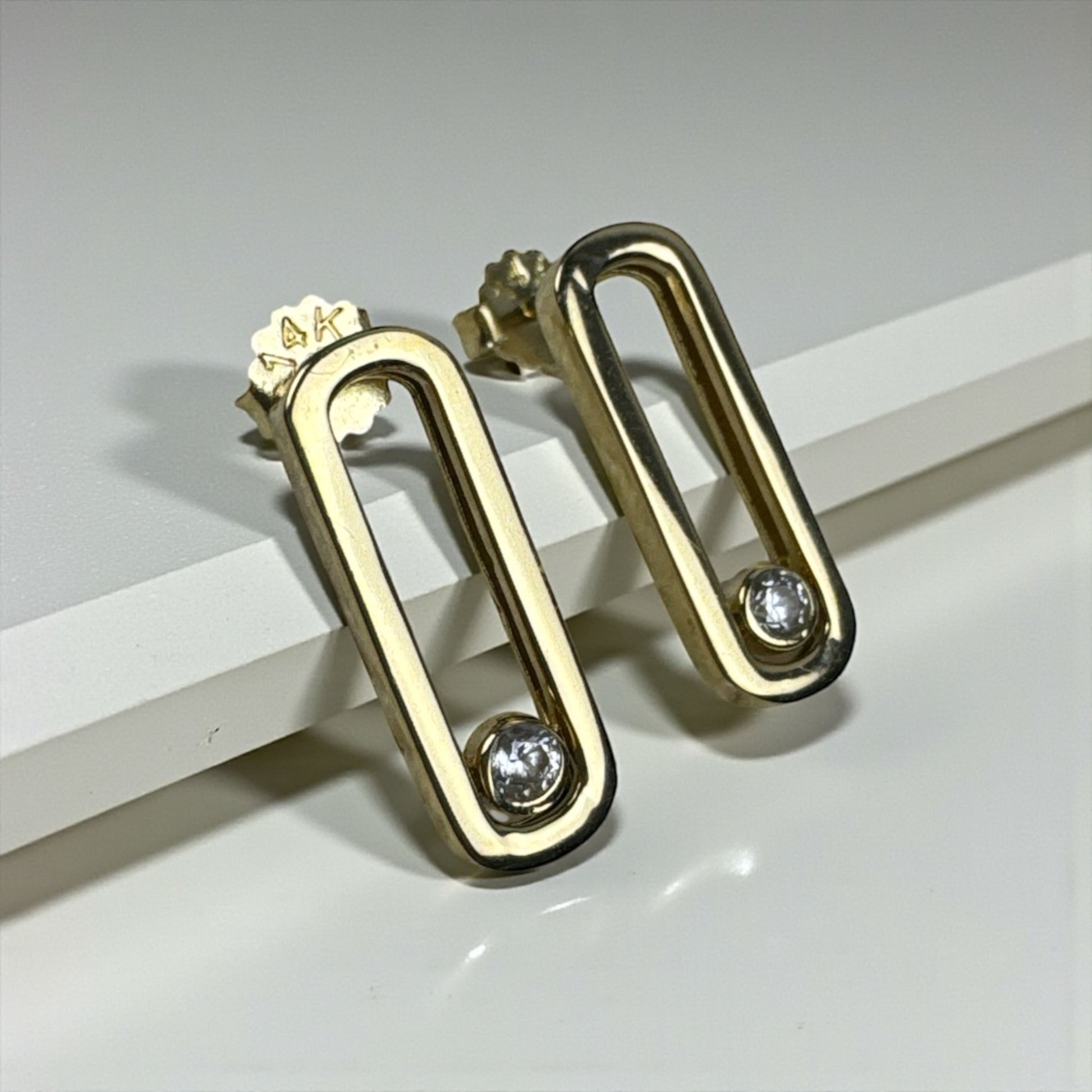 The geometric design features sleek proportions and refined stone accents that add subtle brilliance without overpowering the minimalist aesthetic. The high-polish finish enhances the purity of the gold, delivering a luminous, elegant presence that transitions seamlessly from everyday wear to special occasions.