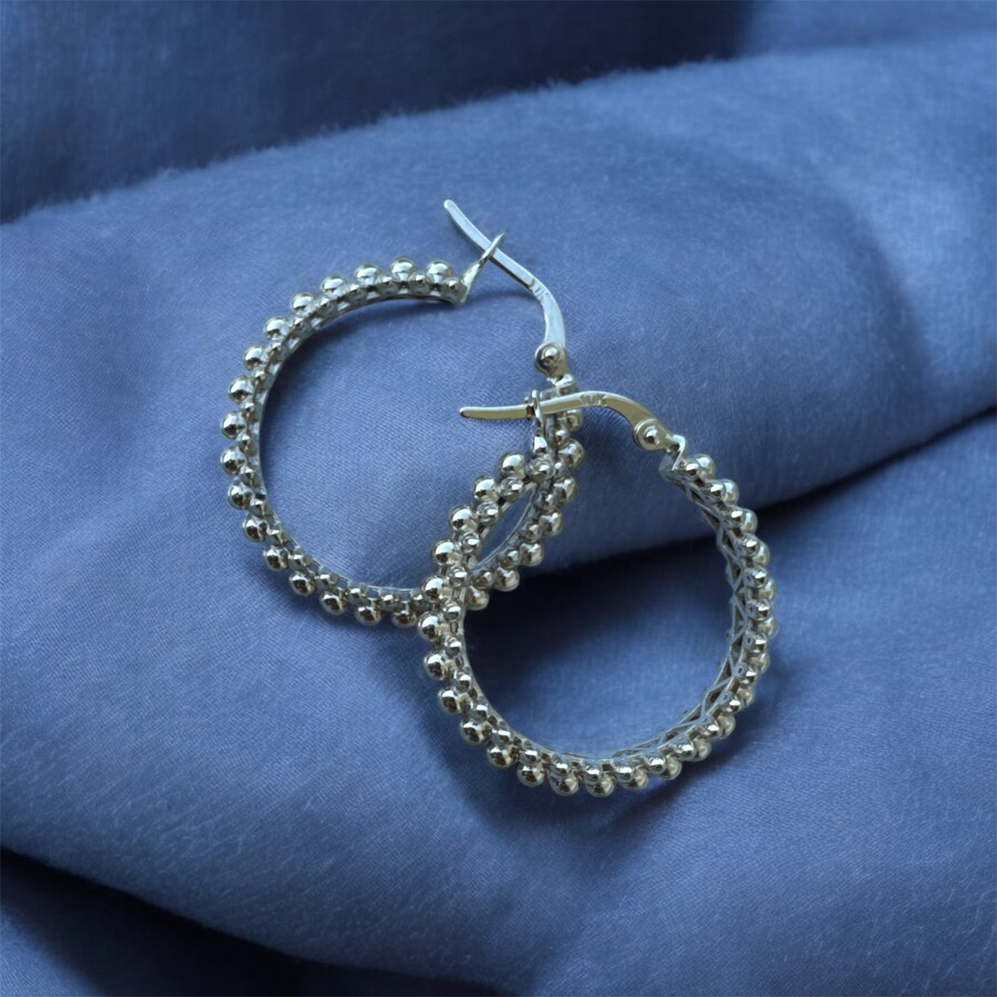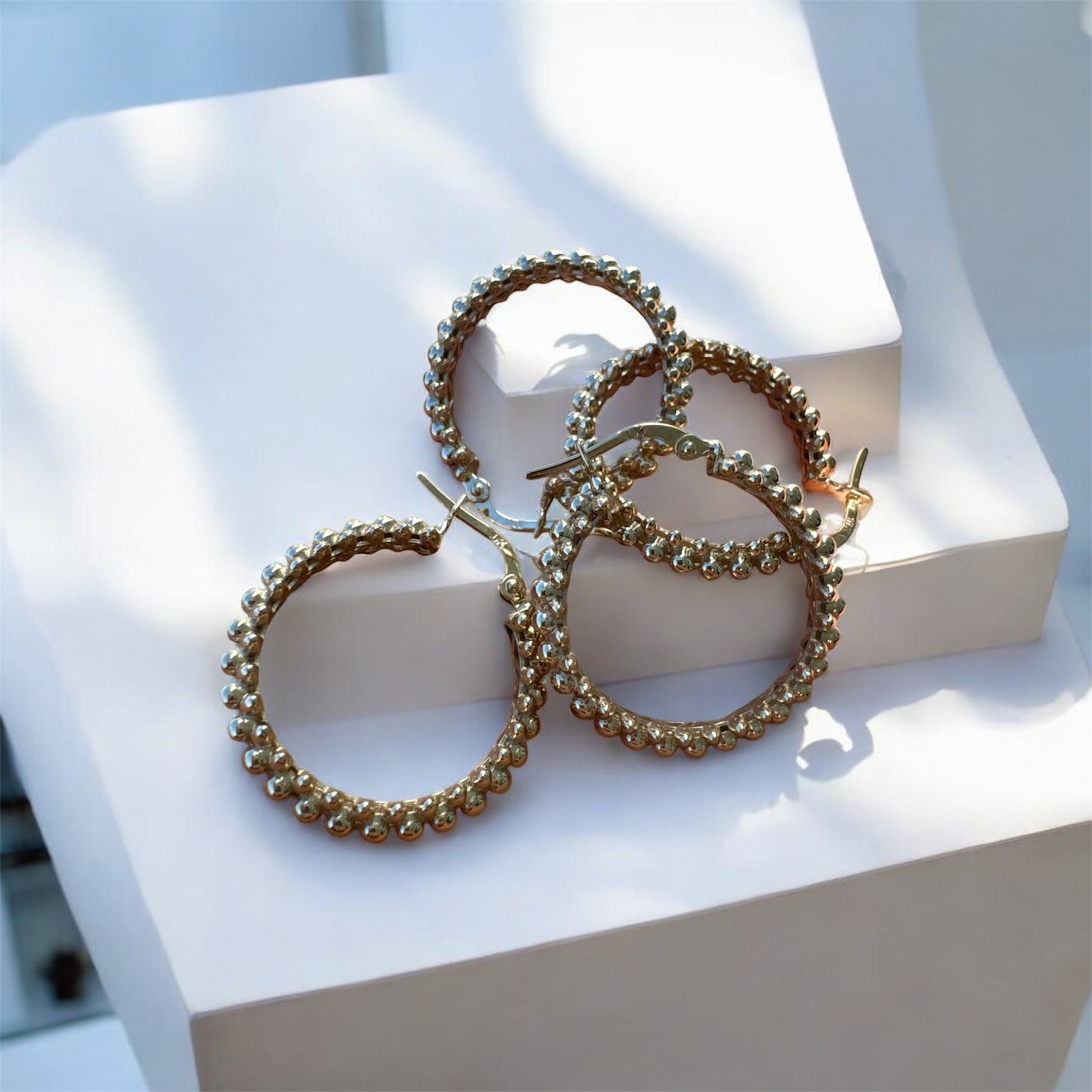 The Beaded Hoop Earrings in 10K Gold are crafted in solid 10K gold, featuring a distinctive beaded texture that adds depth, movement, and subtle brilliance to a classic hoop silhouette. Each rounded bead reflects light beautifully, creating a sophisticated sparkle without excess.